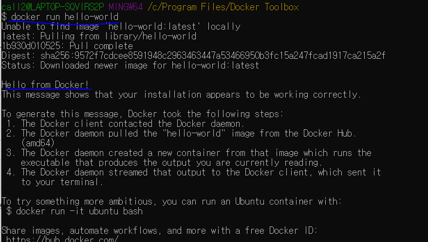4. 화면 처럼 docker run hello-world 를 치고 Hello from Docker!가 뜨면 설치 완료!