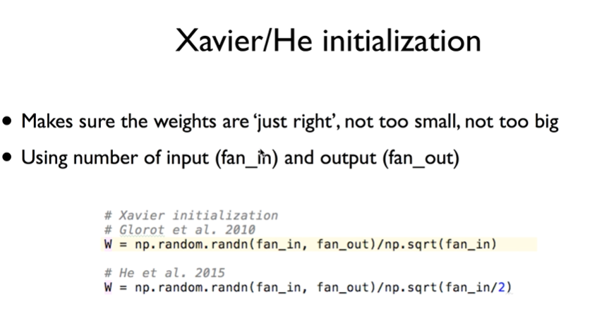 weight을 랜덤하게 주는데 출력과 입력의 수에 맞춰 위에 식처럼 주니깐 RBM과 같은 결과를 낼 수 있다고 한다. 또 다른 주장은 #He~어쩌구 써져있는 식에 /2를 추가하면 더 잘 된다는 이야기도 나왔다는 것이다.