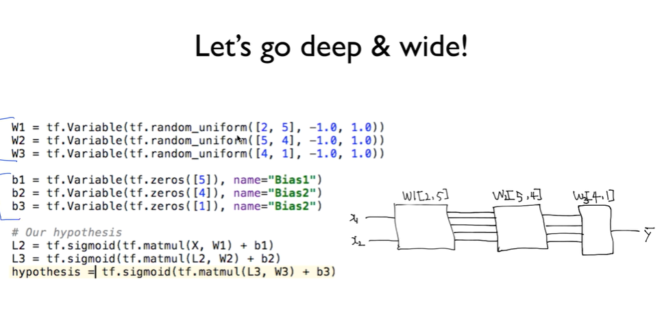 그렇다면 layer가 3개일 때는 어떨까? weight와 bias를 늘려주고 hypothesis를 아래와 같이 조정해주면 된다. 아래의 hypothesis가 이렇게 되는 이유는 이미 전에 포스팅이 되어있다. 단, 여기서 중요한 것은 weight의 tf.random_uniform이다. 만약 아래봐 같이 W1이 2개를 입력으로 주고 5개를 출력하고 싶다면 다음 W2는 입력을 5개를 주어야한다.